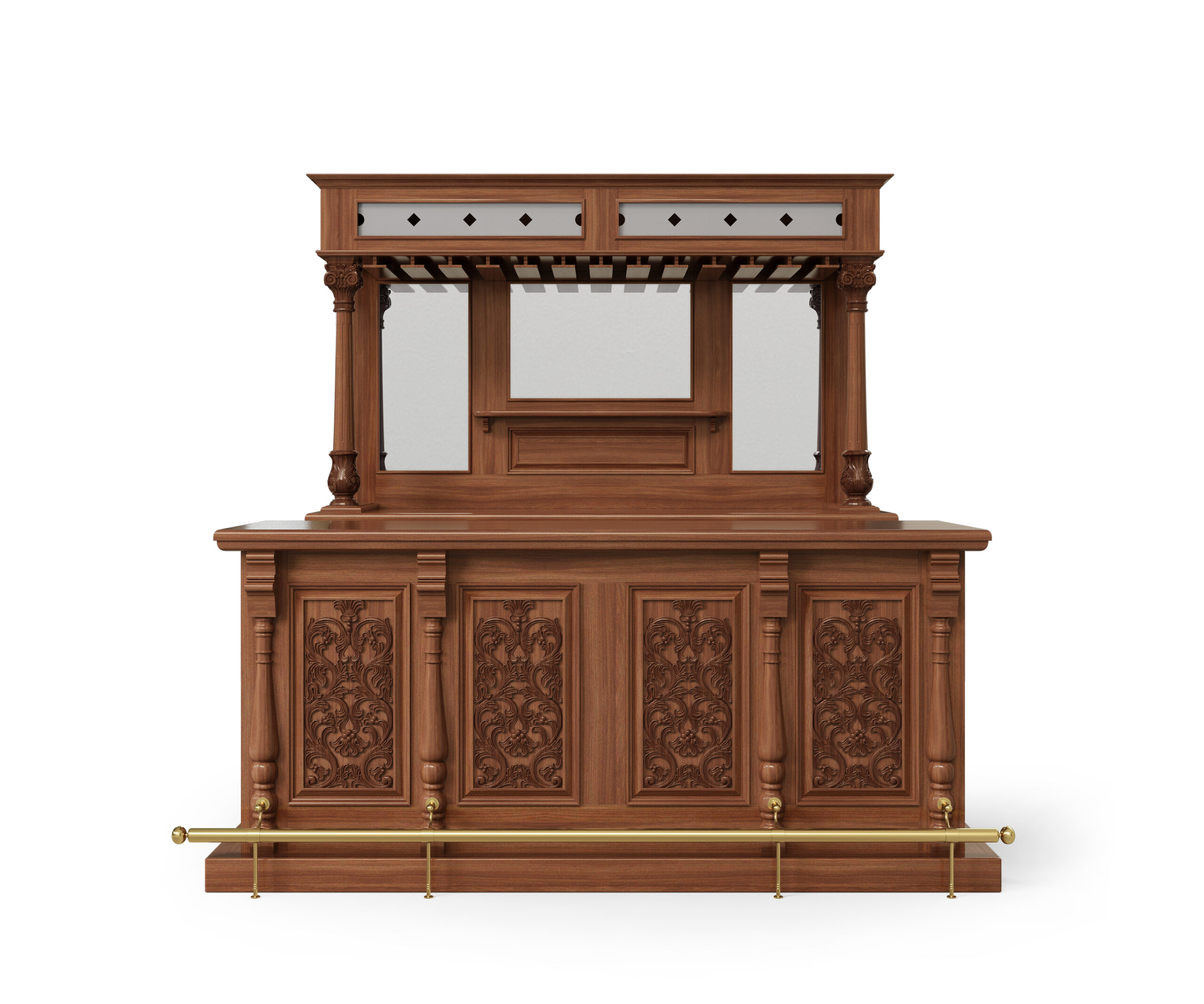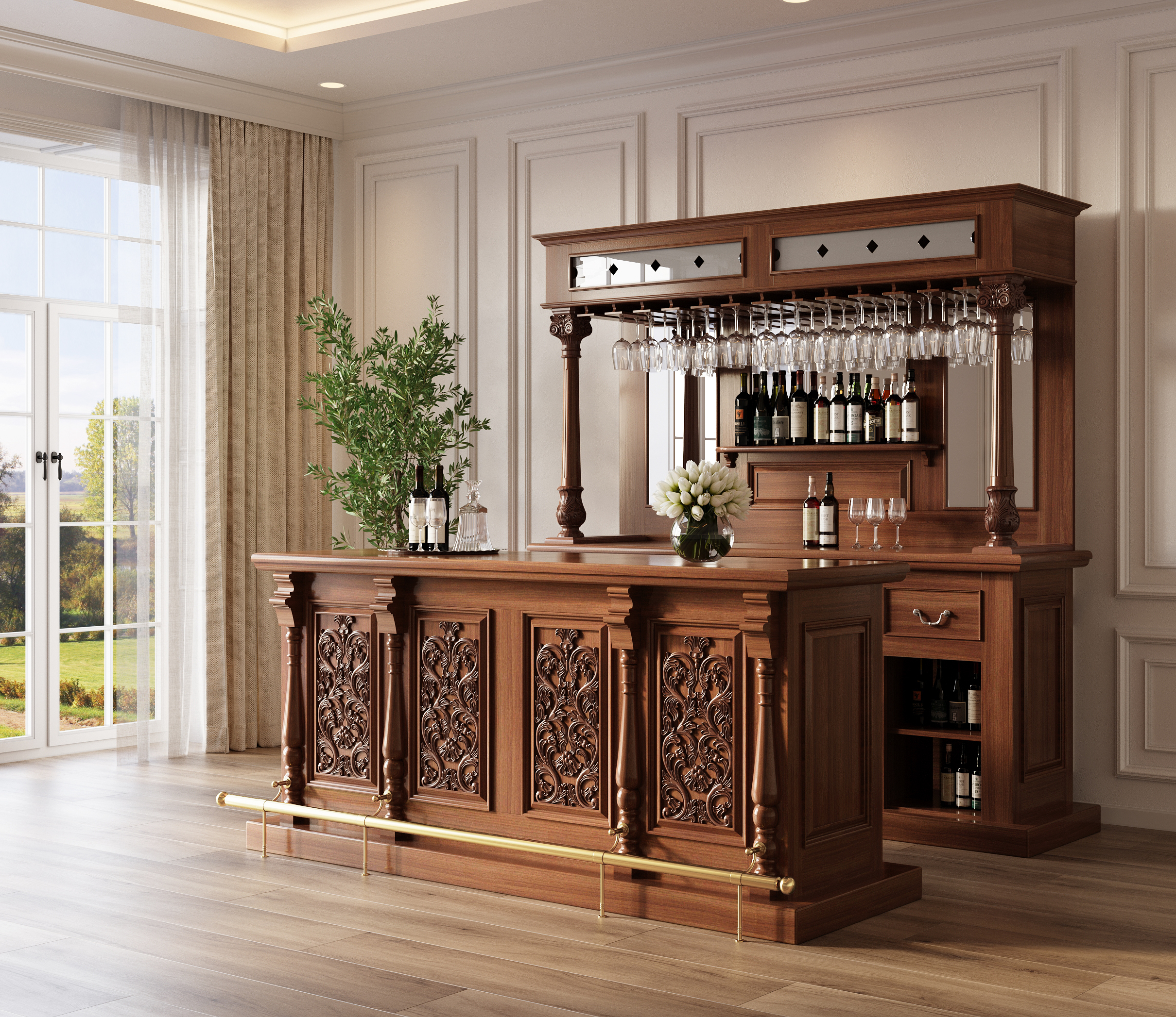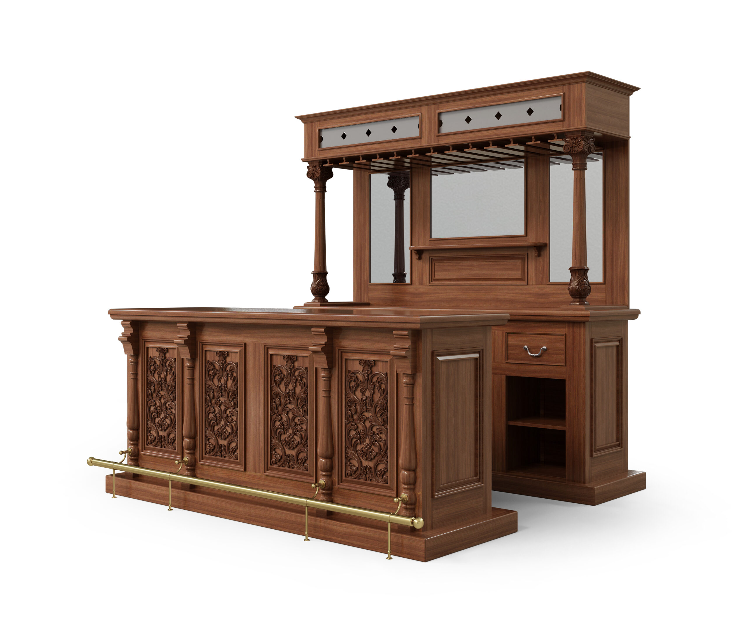 The front of the bar has a very nice top surface and on its front it has gorgeous paneled surfaces richly adorned with floral and foliage carvings and elegant vase and ring turned columns with a luxurious brass foot rails. On its back it offers four additional drawers similar as the back of the bar, two spacious shelves; and two bottle racks that can store up to 30 bottles in total. This bar will compliment many styles and forms of furniture and will bring many years of pleasure and entertainment.