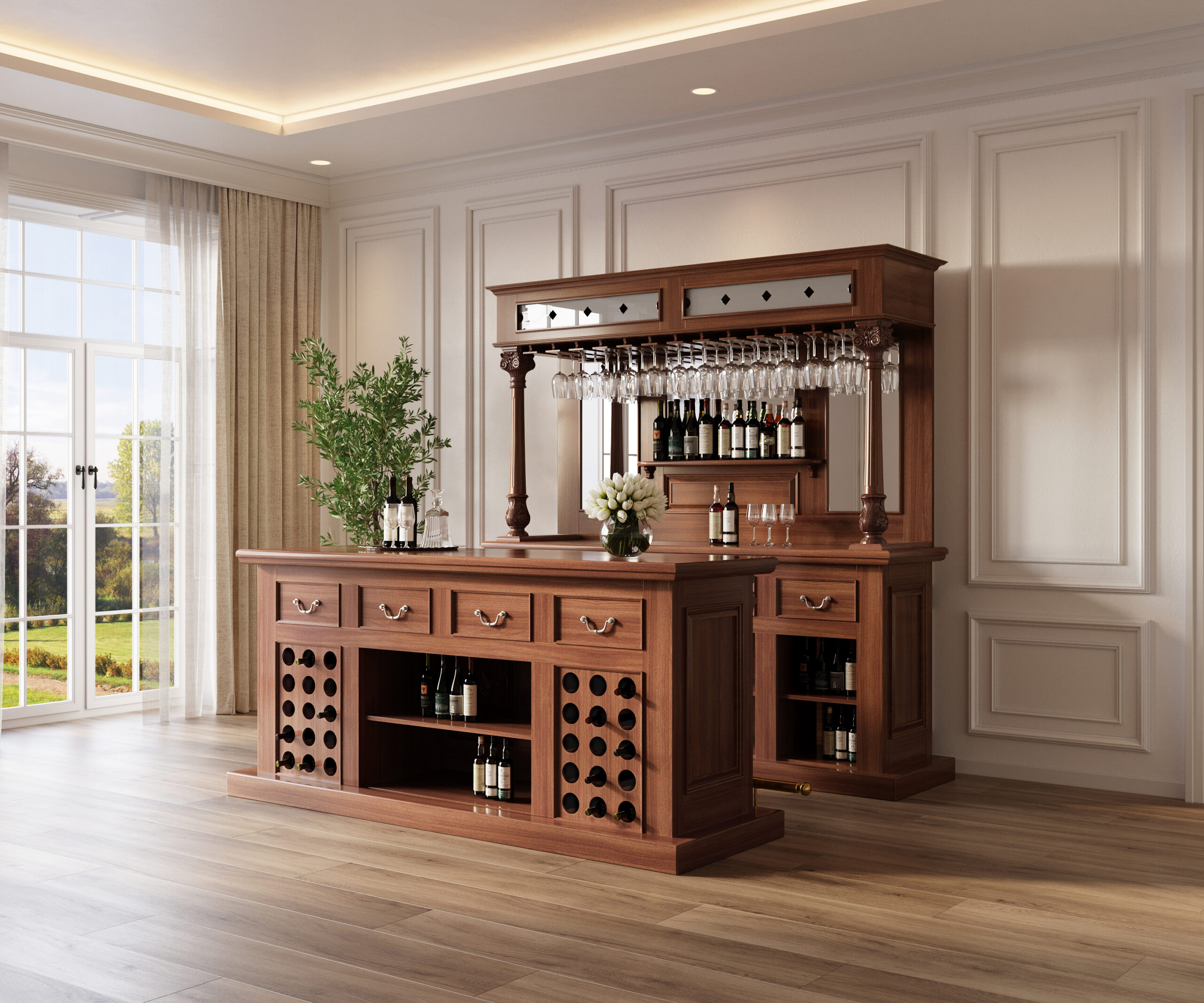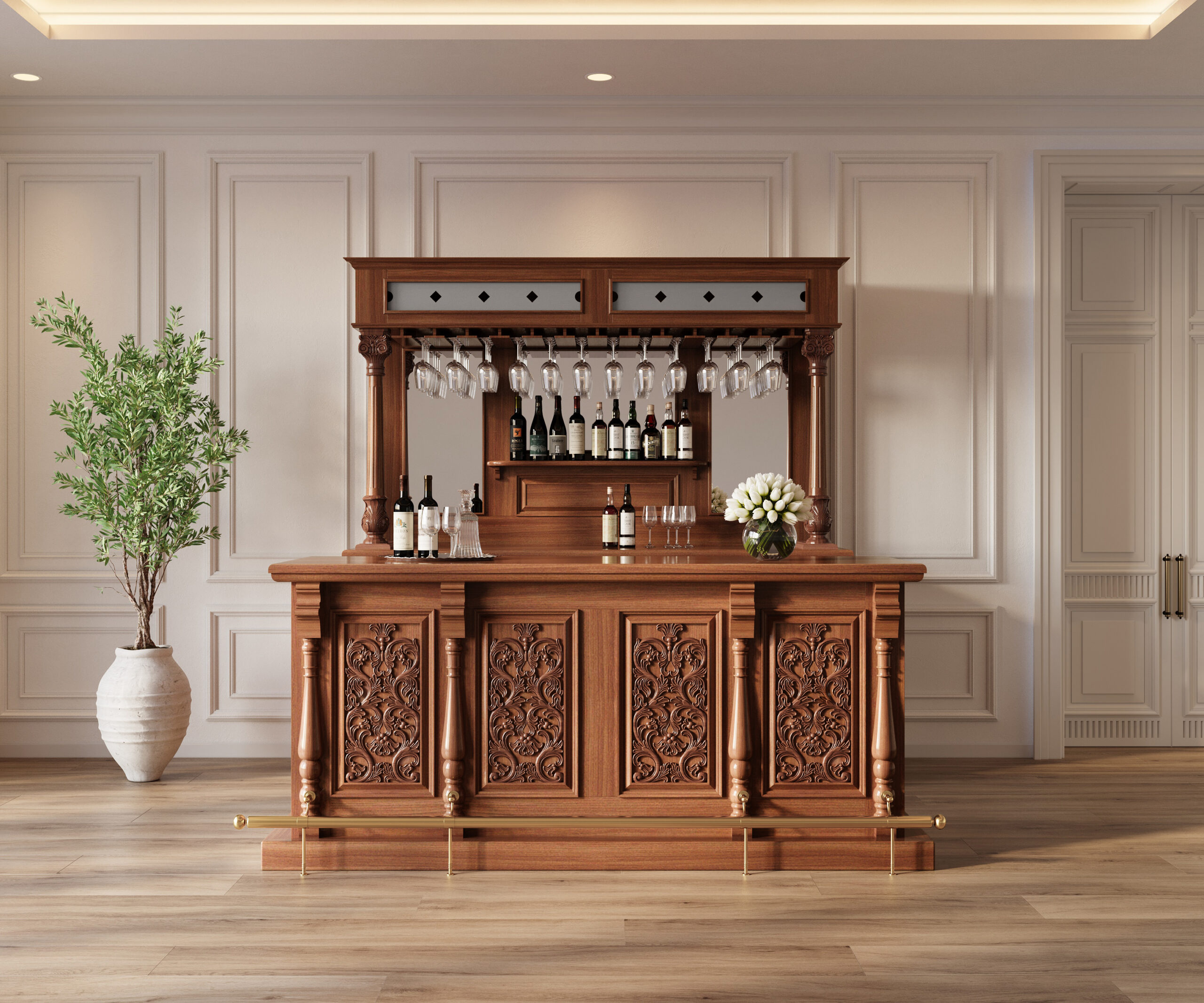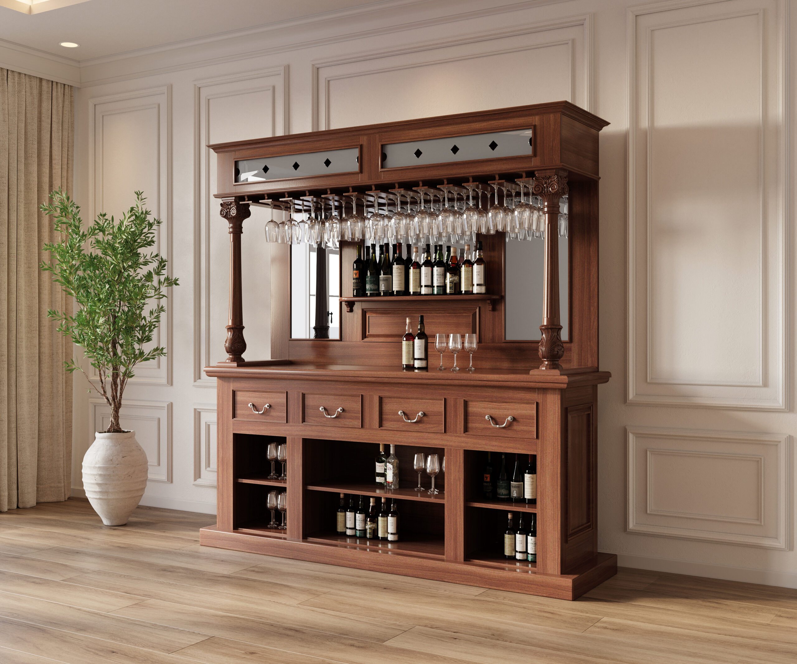 The front of the bar has a very nice top surface and on its front it has gorgeous paneled surfaces richly adorned with floral and foliage carvings and elegant vase and ring turned columns with a luxurious brass foot rails. On its back it offers four additional drawers similar as the back of the bar, two spacious shelves; and two bottle racks that can store up to 30 bottles in total. This bar will compliment many styles and forms of furniture and will bring many years of pleasure and entertainment.