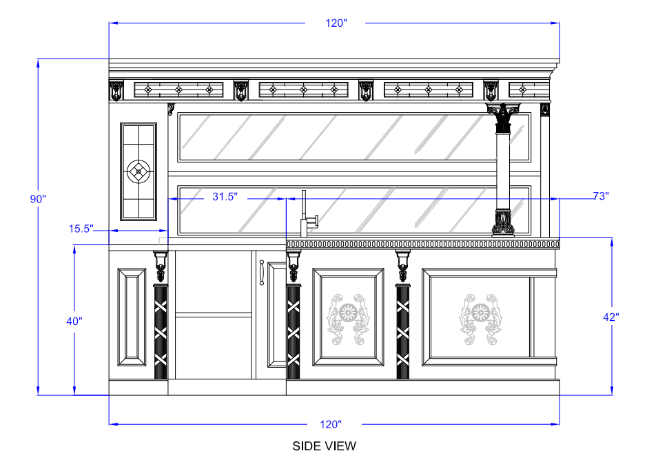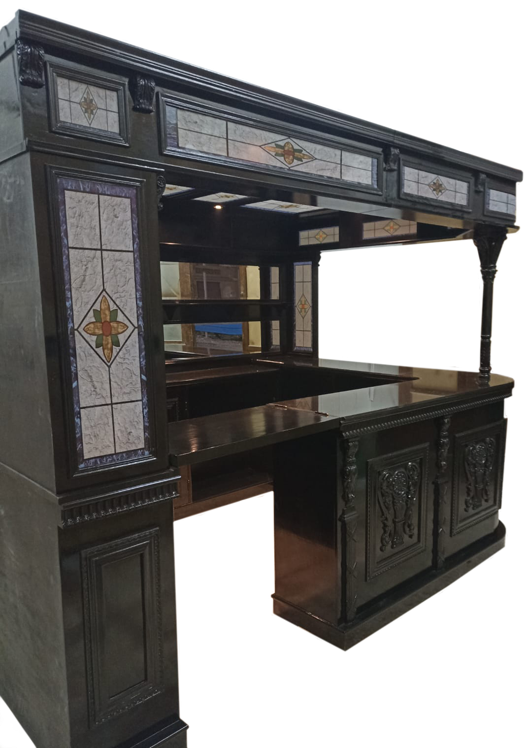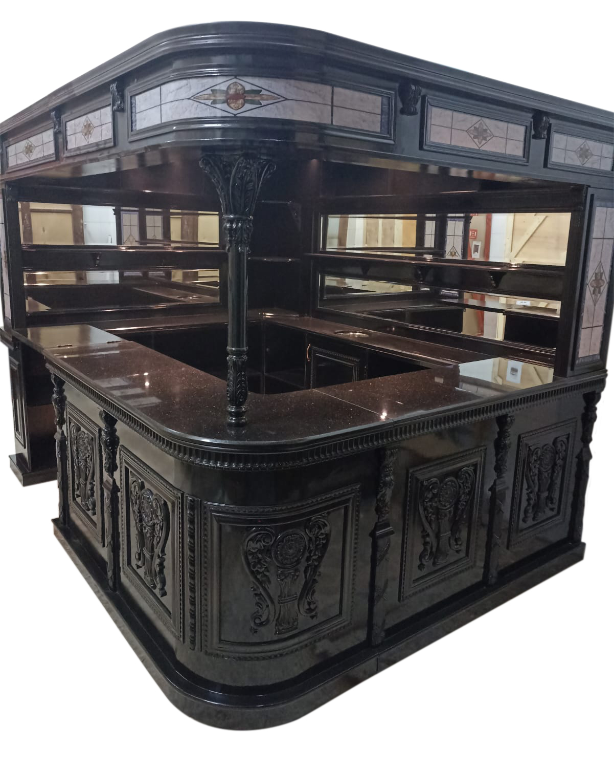 Make a bold statement in any space with this impressive, full-size bar designed to command attention. Its deep, elegant finish and finely carved panels create a rich, vintage vibe, while the stunning black granite countertop adds a luxurious, modern touch. With generous shelving, mirrored backing, and plenty of room to work and entertain, this bar isn’t just furniture—it’s a showpiece. Whether you’re hosting a crowd or building the ultimate home lounge, this oversized bar delivers style, presence, and practicality all in one striking package.