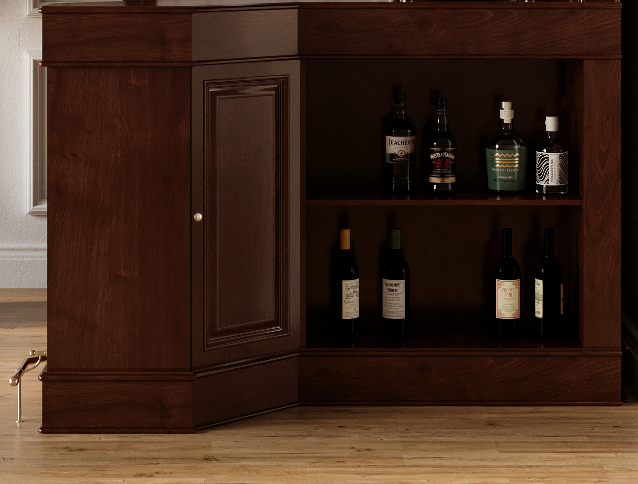 Say hello to the ultimate party starter—your new home bar that’s basically a small VIP lounge disguised as furniture! Crafted from solid and top quality wood and stocked with all the right features, this bar instantly turns any empty corner into the place to be. Step right up and play bartender in your own personal speakeasy. Making such a statement from a corner, it’s charming, classy, and just a little bit mischievous—exactly what every great night needs. Cheers!
